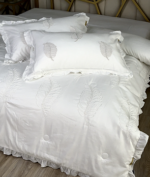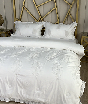 Комплекты с одеялом украшены вышивкой из натурального хлопка. Стильное  постельное белье не оставят никого равнодушным.Одеяло выполнена с  кружевом по краю, что придаёт нежность и воздушность.Ткань легкая, мягкая, приятная к телу, не требует особого ухода и глажки.